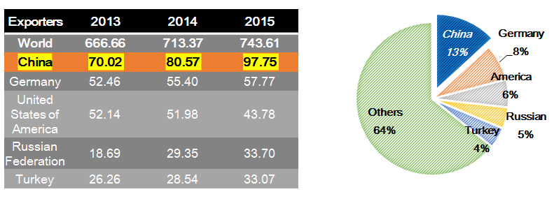2015年埃及貿(mào)易進(jìn)口總額為743.61億美元,其中,中國對埃及出口97.75億美元,占比13%。是埃及第一大進(jìn)口來源國。