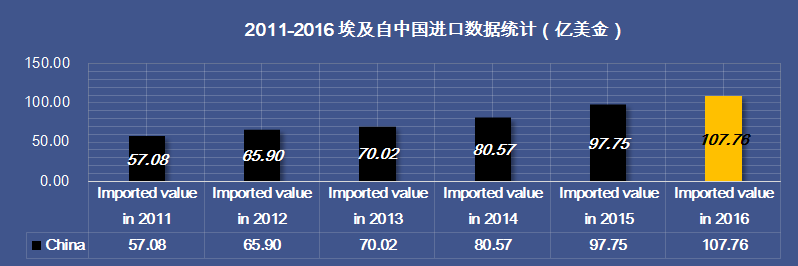 ?2016年,中國與埃及雙邊貨物進(jìn)出口額為113.25億美元,比去年同期(下同)下降12.03%。其中,中國對埃及出口107.76億美元,下降9.92%。受埃及實(shí)行進(jìn)口注冊制影響。