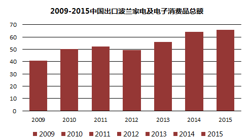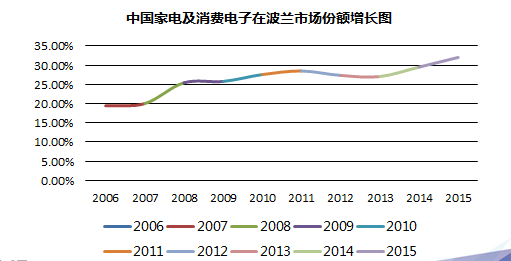 波蘭進口中國家電及電子消費品穩(wěn)步增加,且所占比例越來越多,2015年進口家電及電子消費品中32.01%來自中國。