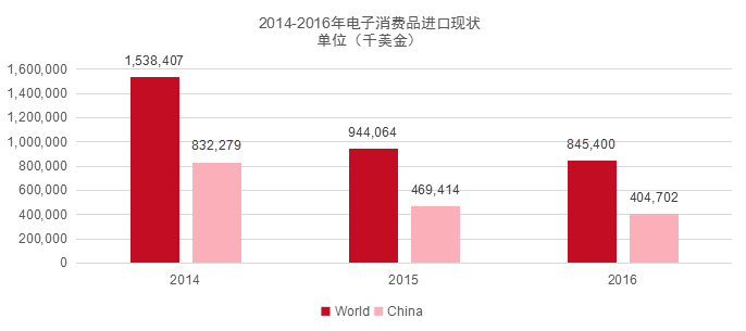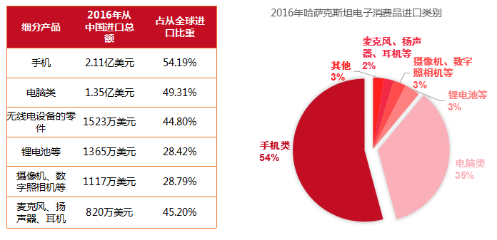 2016年哈薩克斯坦電子消費(fèi)品從世界進(jìn)口總額為8.46億美元,其中自中國(guó)進(jìn)口4.04億美元,占比47.84%。熱銷產(chǎn)品進(jìn)口量前三名的分別為手機(jī)類、電腦類、無線電設(shè)備零件等。