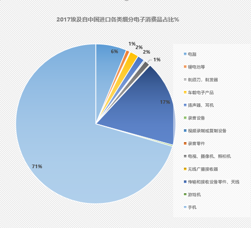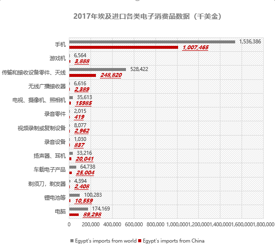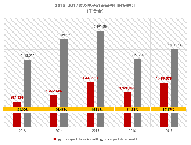 2017年埃及電子消費(fèi)品進(jìn)口量達(dá)25.01億美元。其中自中國(guó)進(jìn)口14.30億美元,占比57.17%。近五年,埃及自中國(guó)進(jìn)口家電增長(zhǎng)了74.2%,中國(guó)電子消費(fèi)品制造受到埃及人民歡迎。