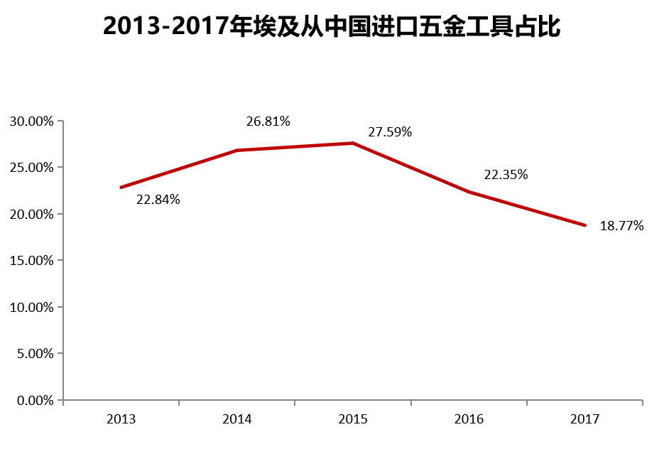 2013-2017年,埃及從中國進口的主要五金產(chǎn)品占比基本維持穩(wěn)定,占比均值為23.67%。2017年埃及從中國進口五金工具占比18.77%。