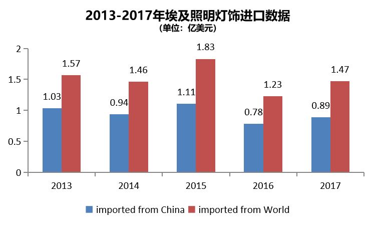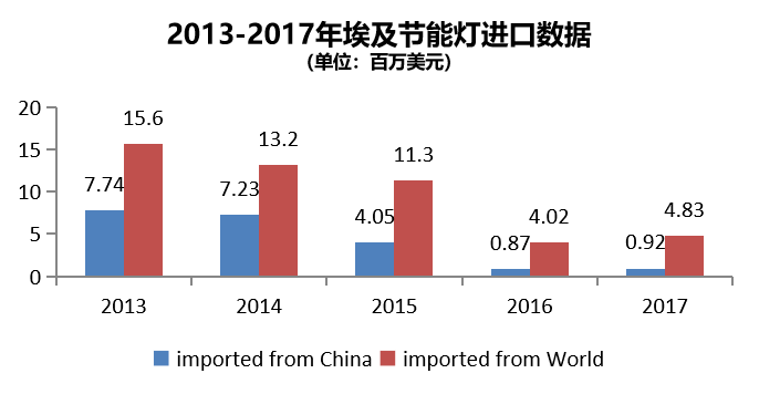 2017年埃及節(jié)能燈總進(jìn)口483萬美元,從中國進(jìn)口92萬美元,占比19.1%。