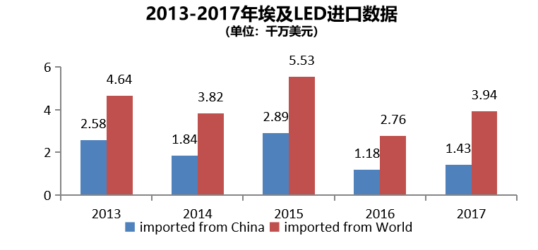 2017年埃及LED燈總進(jìn)口額3940萬美元,從中國進(jìn)口1430萬美元,占比36.3%。