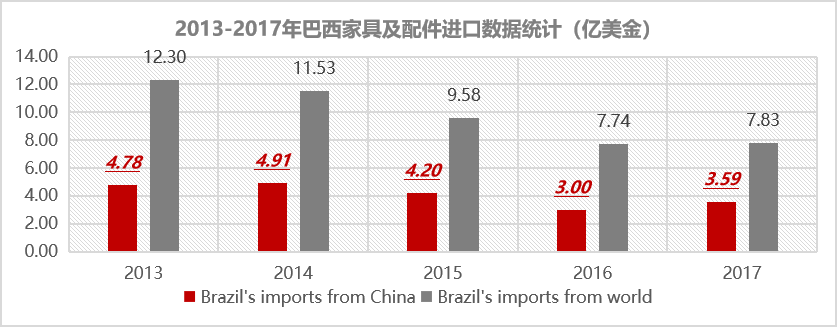 2017年巴西全球家具進(jìn)口額達(dá)7.83億美元。其中自中國進(jìn)口的家具占45.85%,約3.59億美元。