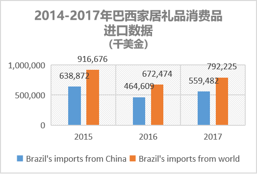 2017年巴西家居禮品及消費(fèi)品總進(jìn)口額為7.92億美元,自中國進(jìn)口相關(guān)產(chǎn)品總金額高達(dá)5.59億美元,占比69.69%,是巴西家居禮品消費(fèi)品的第一進(jìn)口來源國。