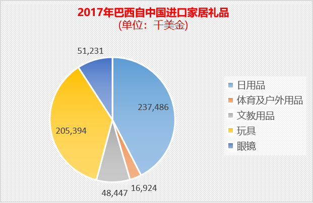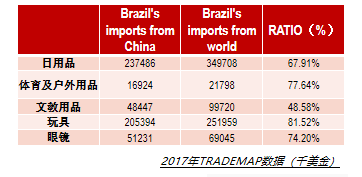 2017年日用品出口巴西2.37億美金、玩具2.05億美金、眼鏡0.51億美金。