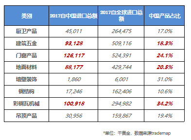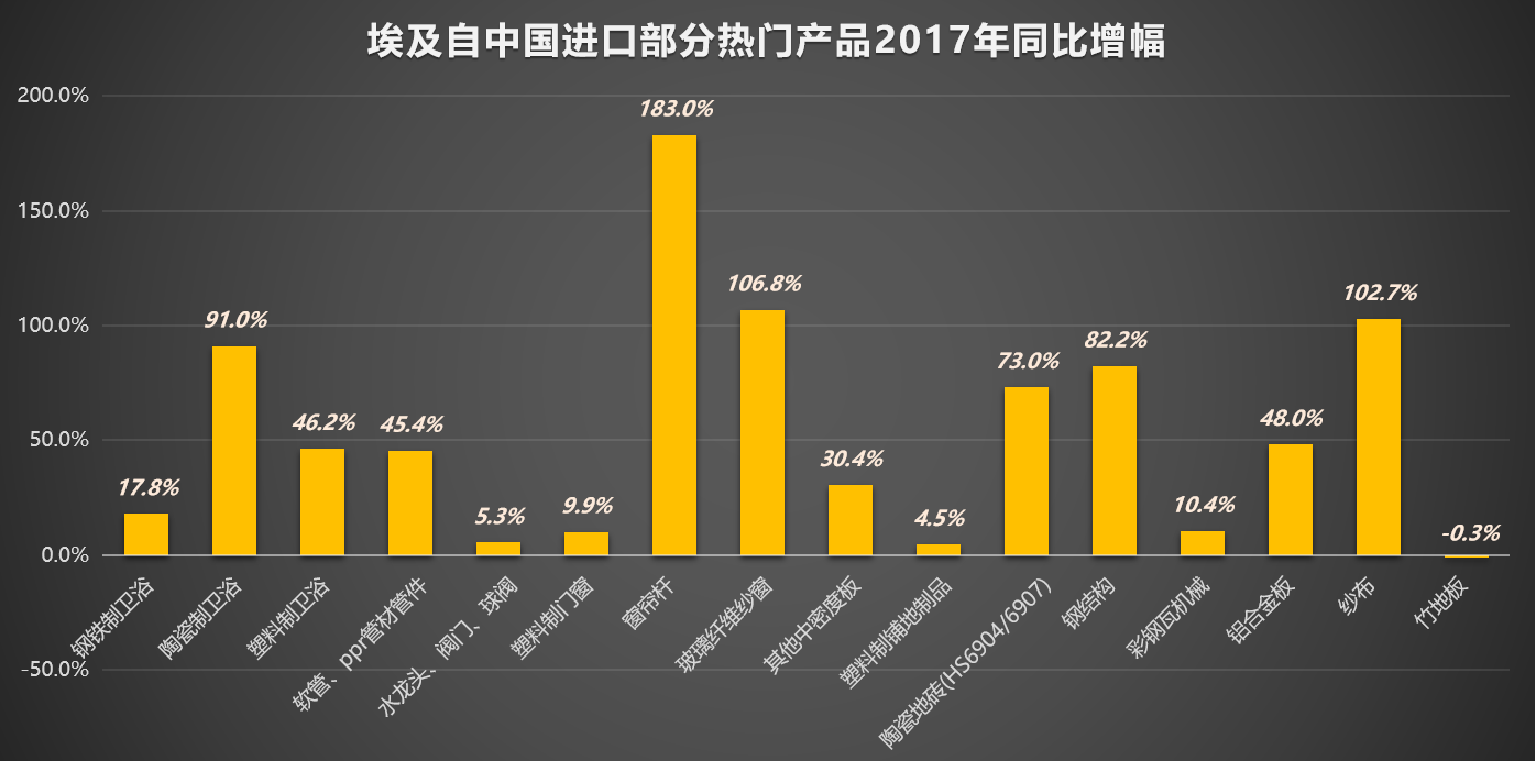 從埃及海關(guān)進(jìn)口數(shù)據(jù)看,2017年埃及自中國進(jìn)口金額最大的建材產(chǎn)品為門窗產(chǎn)品、彩鋼瓦機(jī)械、建筑五金、地面材料產(chǎn)品等。其中,2017年埃自中進(jìn)口門窗類產(chǎn)品為1.26億美元。