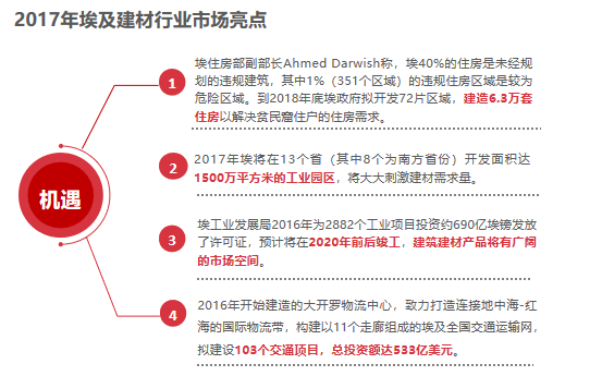 埃及是中東和非洲經(jīng)濟(jì)增長最快也是最大的國家,目前基建工程市場需求巨大,比如行政首都建設(shè)、經(jīng)濟(jì)特區(qū)建設(shè),同時計劃在13個地區(qū)建造100萬個經(jīng)濟(jì)適用住房,價值約400億美元。