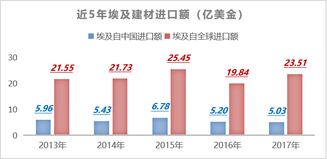 2017年埃及建材產(chǎn)品全球總進(jìn)口額達(dá)23.51億美元,相較2016年增幅高達(dá)18.5%。自2016年底,隨著經(jīng)濟(jì)改革和新投資法的頒布和落實,埃及經(jīng)濟(jì)復(fù)蘇,各大型項目也開始啟動,埃及建材需求明顯回暖。其中自中國進(jìn)口相關(guān)產(chǎn)品達(dá)5.03億美元,占埃及同類產(chǎn)品總進(jìn)口額的21.4%。