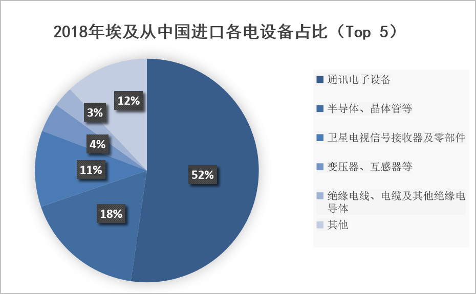 2018年埃及從中國進口的電力設(shè)備中,通訊電子設(shè)備占比最多,占比52%,半導(dǎo)體、晶體管、衛(wèi)星電視信號接收器及零部件等分別排名二、三,占比18%和11%。