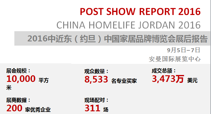 第十三屆中近東(約旦)中國家居品牌博覽會于2016 年9 月 5 日在安曼國際展覽中心成功舉行。該展會是目前中國在約旦舉辦的規(guī)模最大的展會。