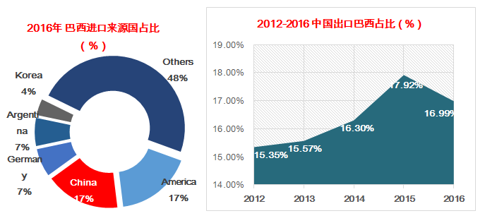 ?同時,2012年中國貨物出口巴西占比為15.35%,2016年攀升至16.99%。