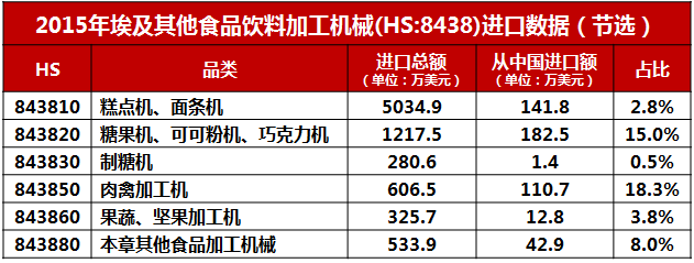 3、2015年埃及自中國進(jìn)口的食品機械規(guī)模達(dá)到3350.2萬美元,市場占比10.2%,同比增長42.9%。。其中“乳制品加工機械、谷物加工機械、動植物油脂加工機械”在當(dāng)?shù)匾欢ㄈ〉昧艘欢ǖ氖袌稣J(rèn)可度。